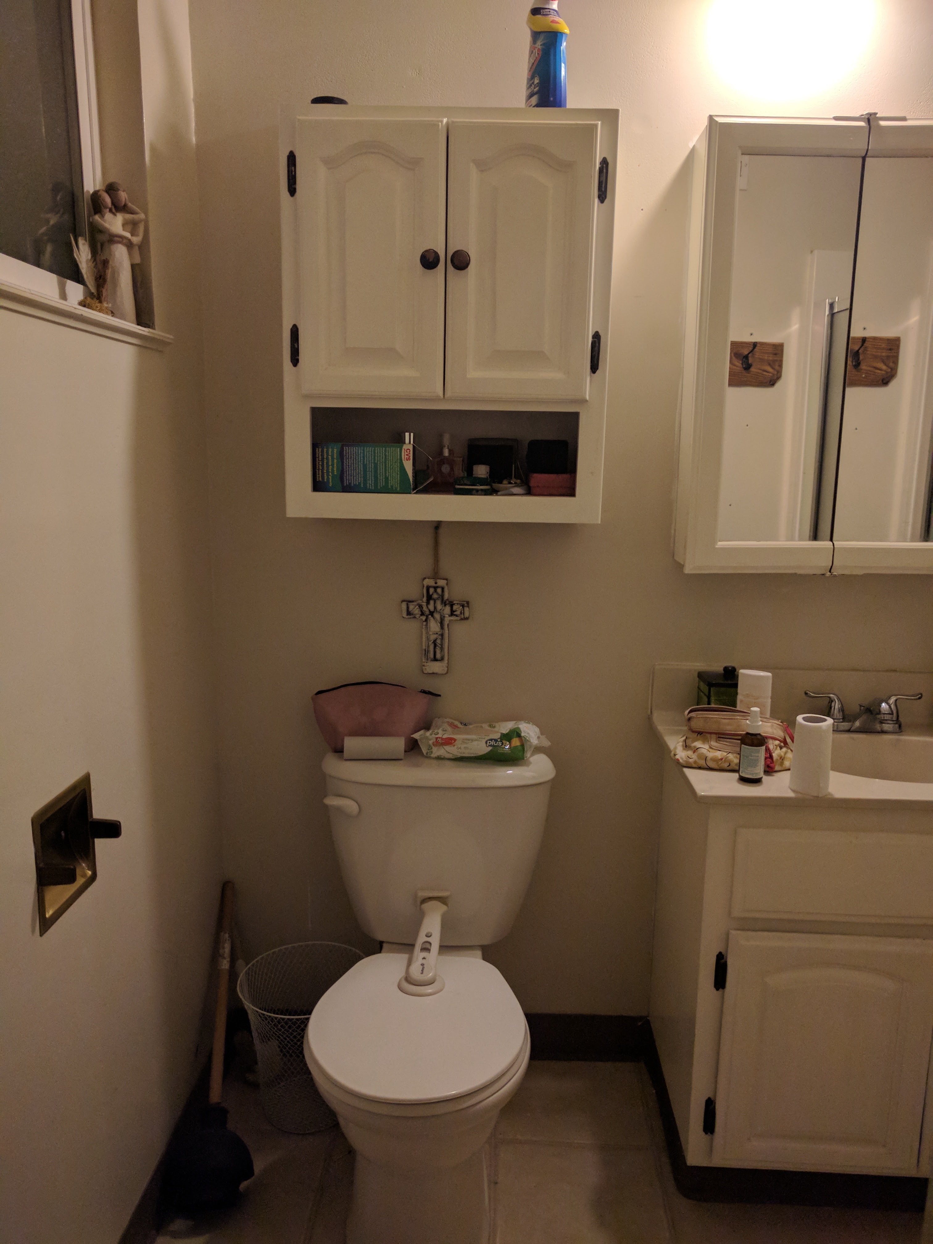 We hemmed and hawed over the vanity for the longest time. We finally settled for one from Home Depot. I wasn’t sure at first and we had to cut the legs down to fit but I think the final effect is nice and having the drawer storage is perfect.