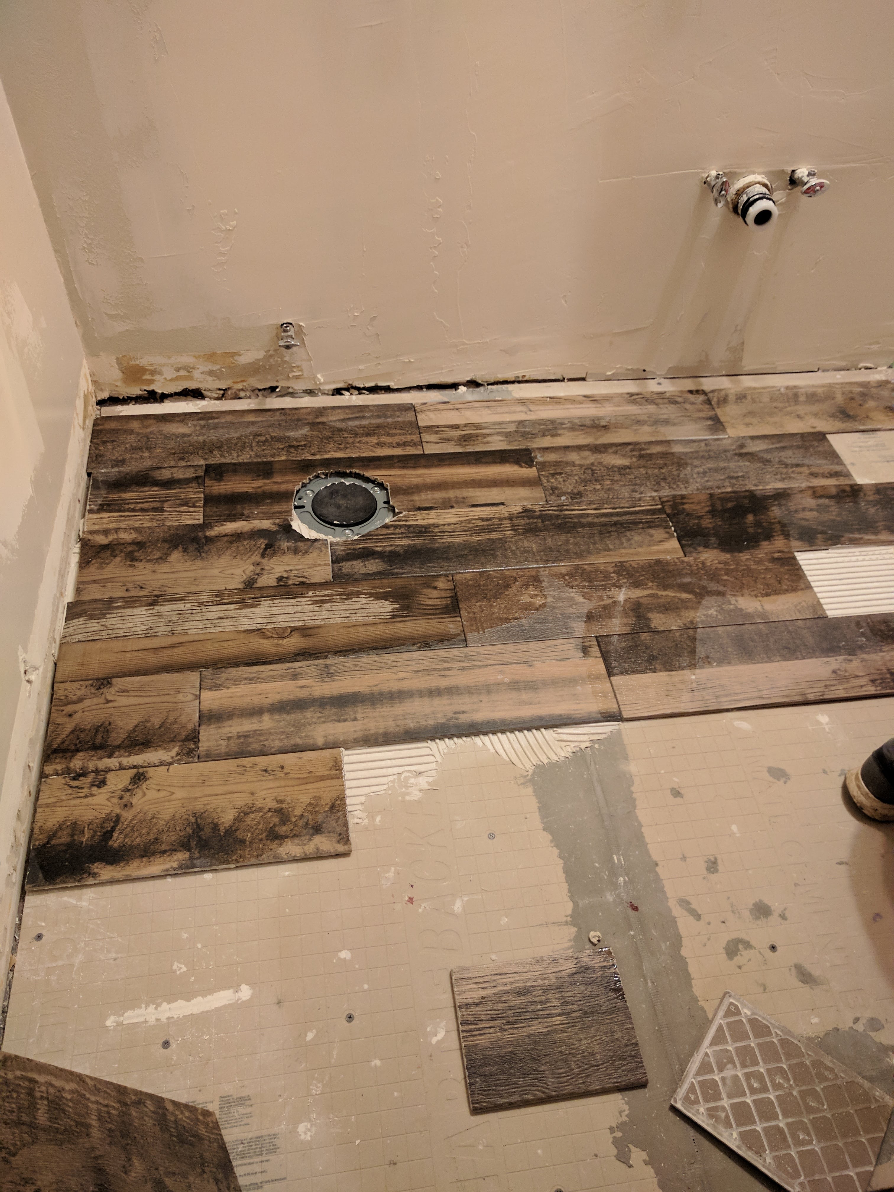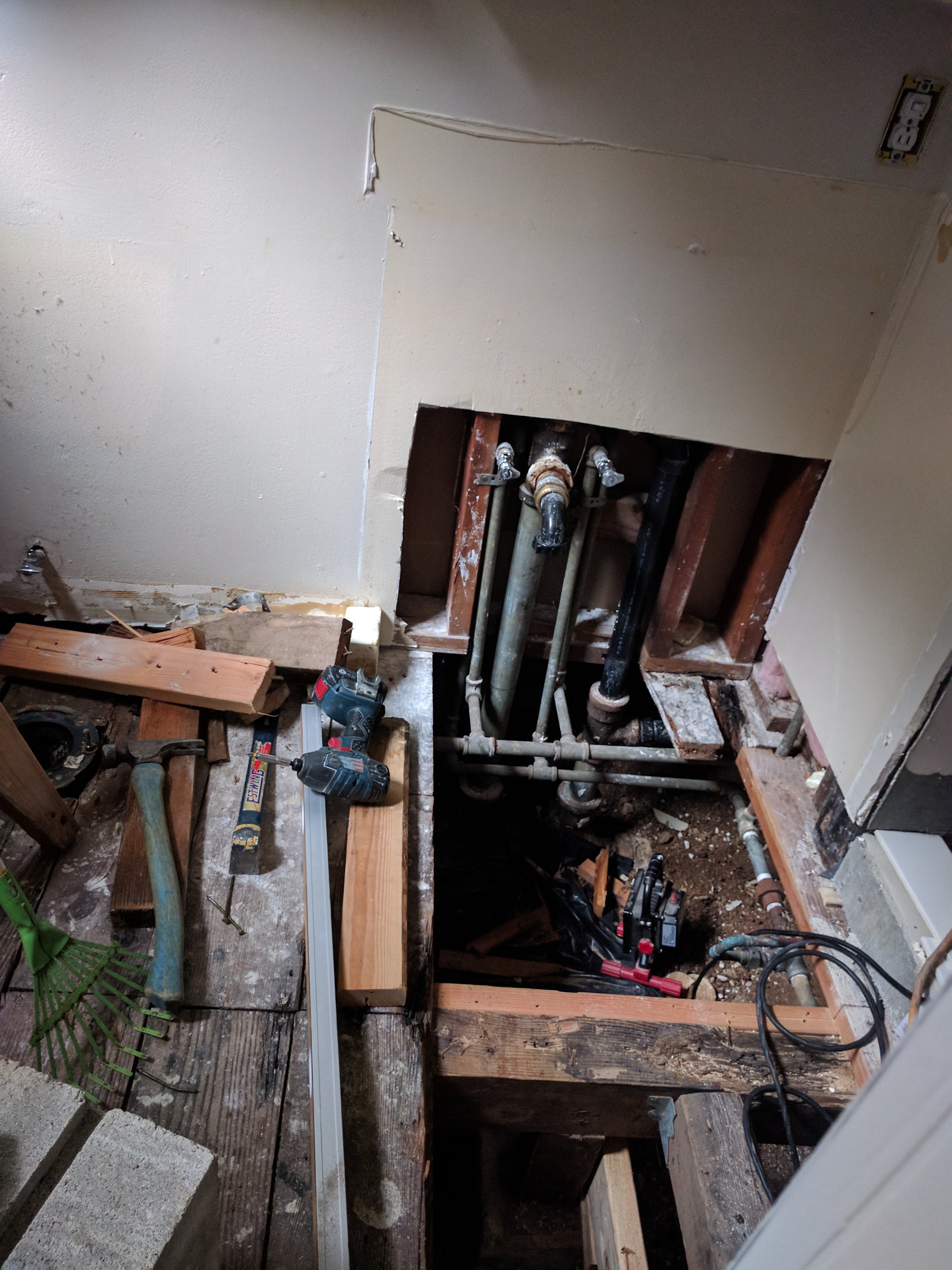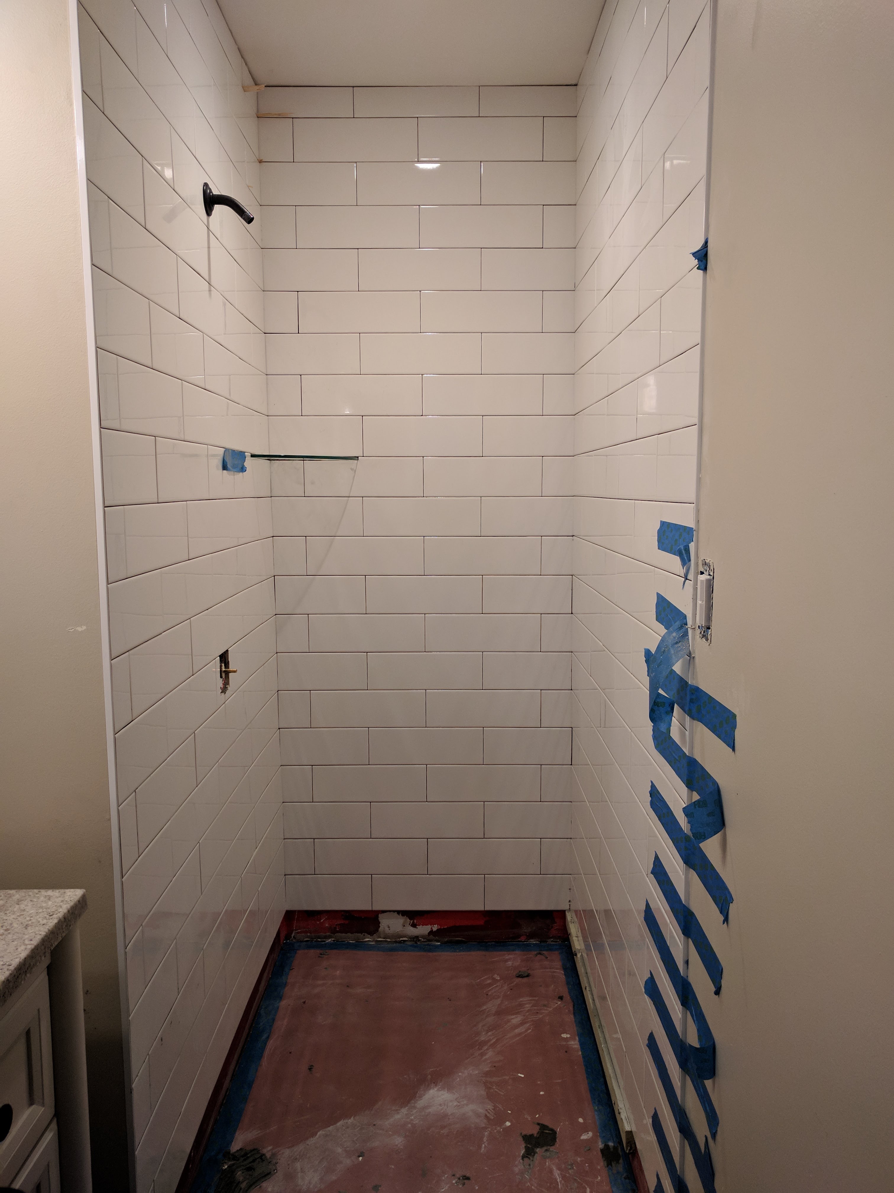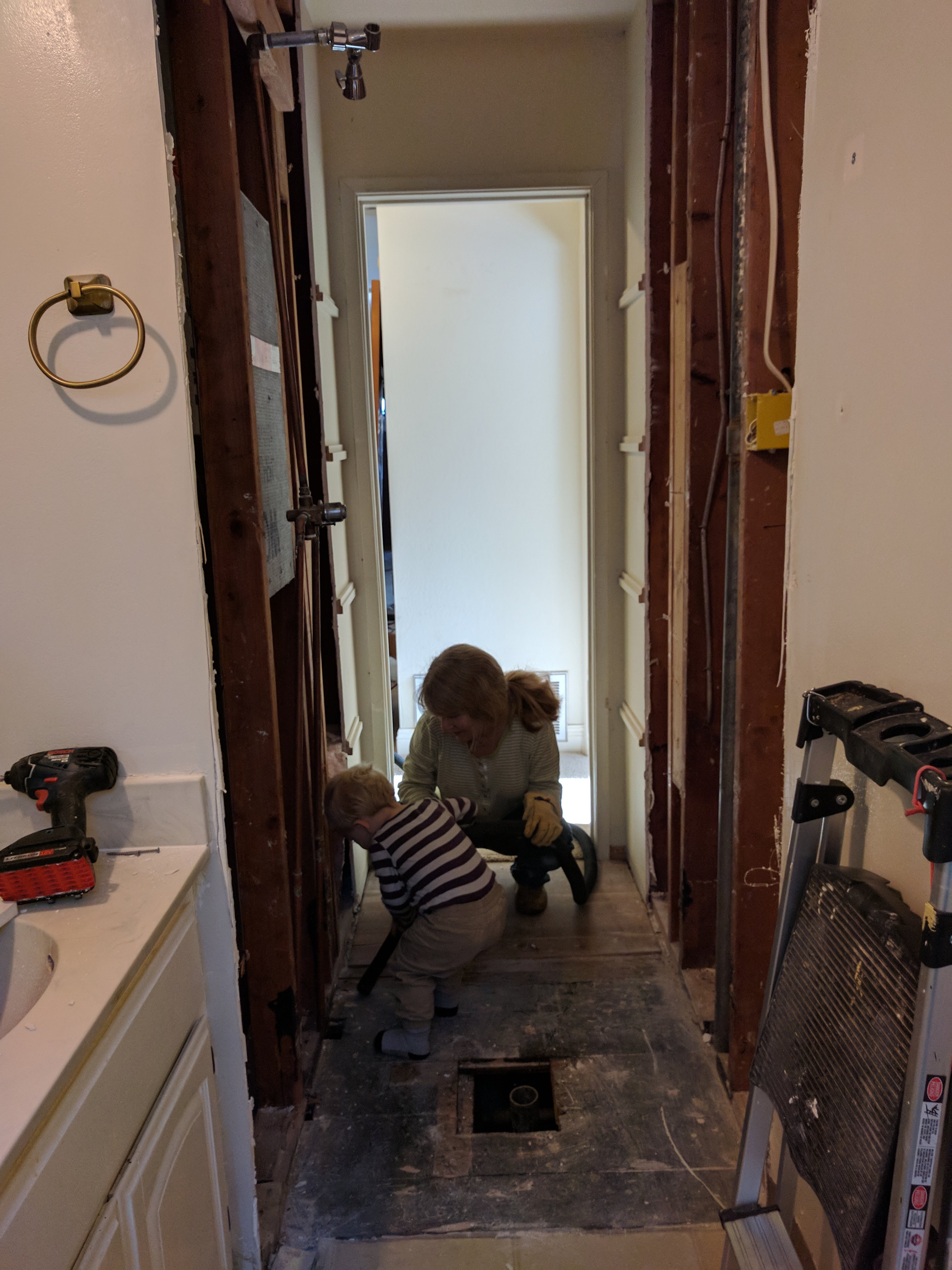 The wall you see in the background is actually our hallway. And the gaping hole? Our shower of course.