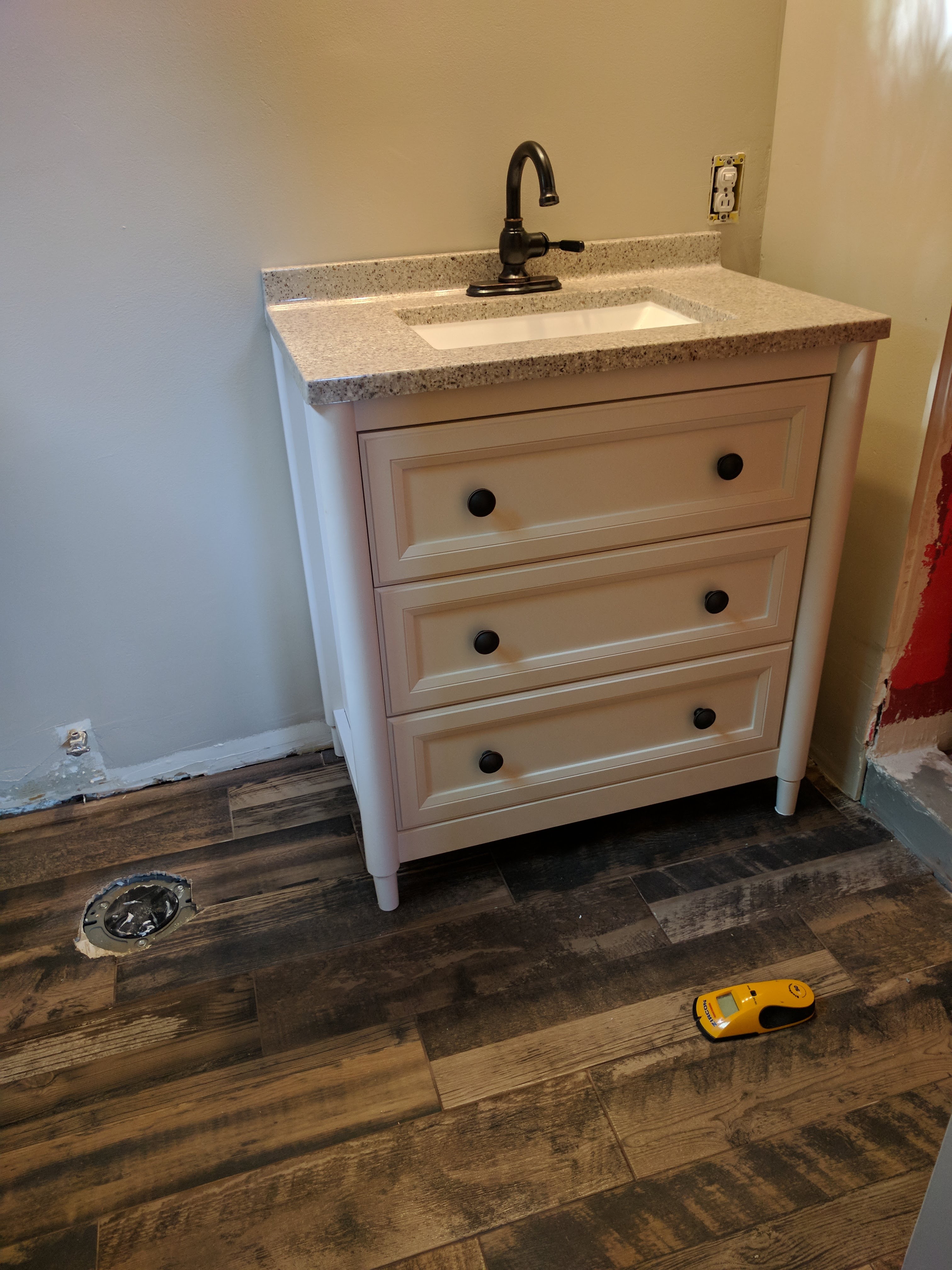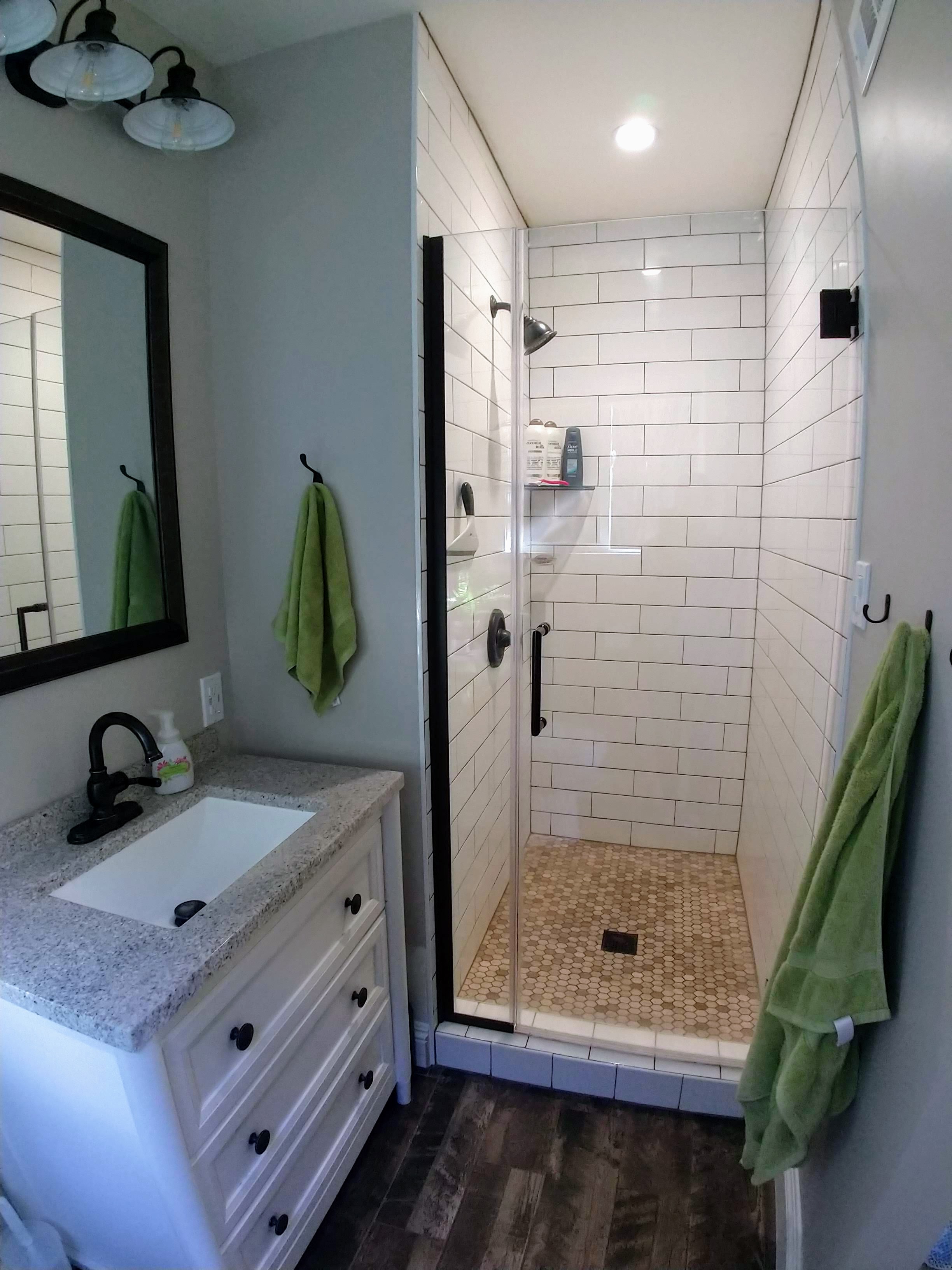 A lot of the problems of before are pretty self explanatory. We are little people but that shower was very tiny (32″ x 32″ to be exact). The vanity was cheap hotel fak-o marble-esque whatever and everything else about the place was underwhelming. So we (or rather hubs) got to work.