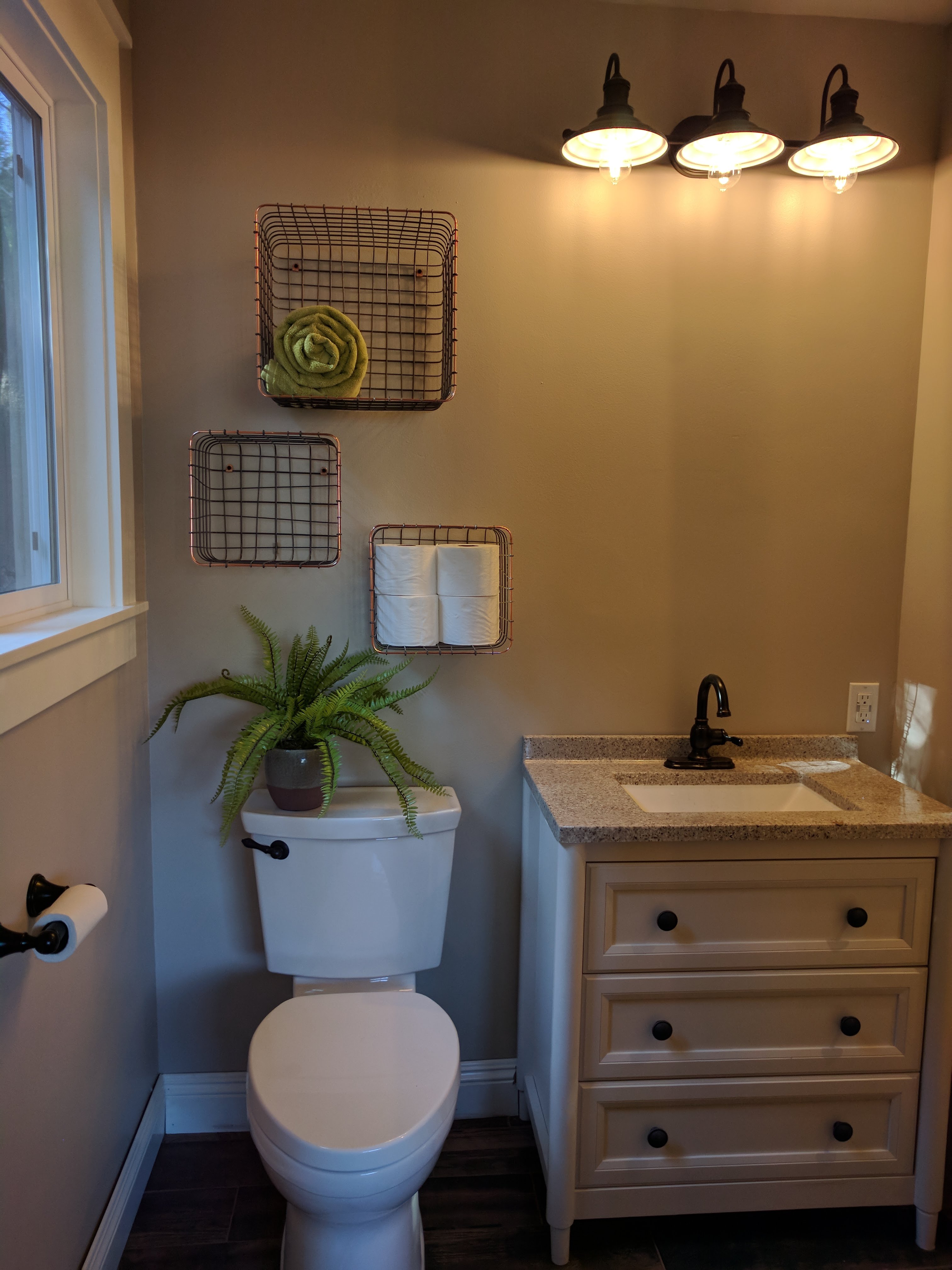 One of our favorite last minute details is the decision to re-purpose three wire baskets with copper accents (Target) for our above-toilet storage. It was a really cheap way to add some fun and functional interest.