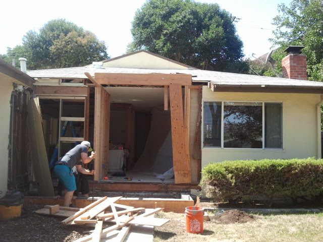 After smashing a sizable chunk of our house out, we started “adulting” and walked down the two blocks to our local city hall and got our plans approved. Permits in hand, the now official plan would include a small addition of about 40 square feet and included a nice bump out to create a larger entry way space and would utilize a funky dead space in the front yard for a kitchen pantry. We would keep the additional weight bearing beams and columns between the living and kitchen spaces, but open up as much as we could to create a light, airy feel. A built-in breakfast nook would replace the awkward empty space at the end of the kitchen.