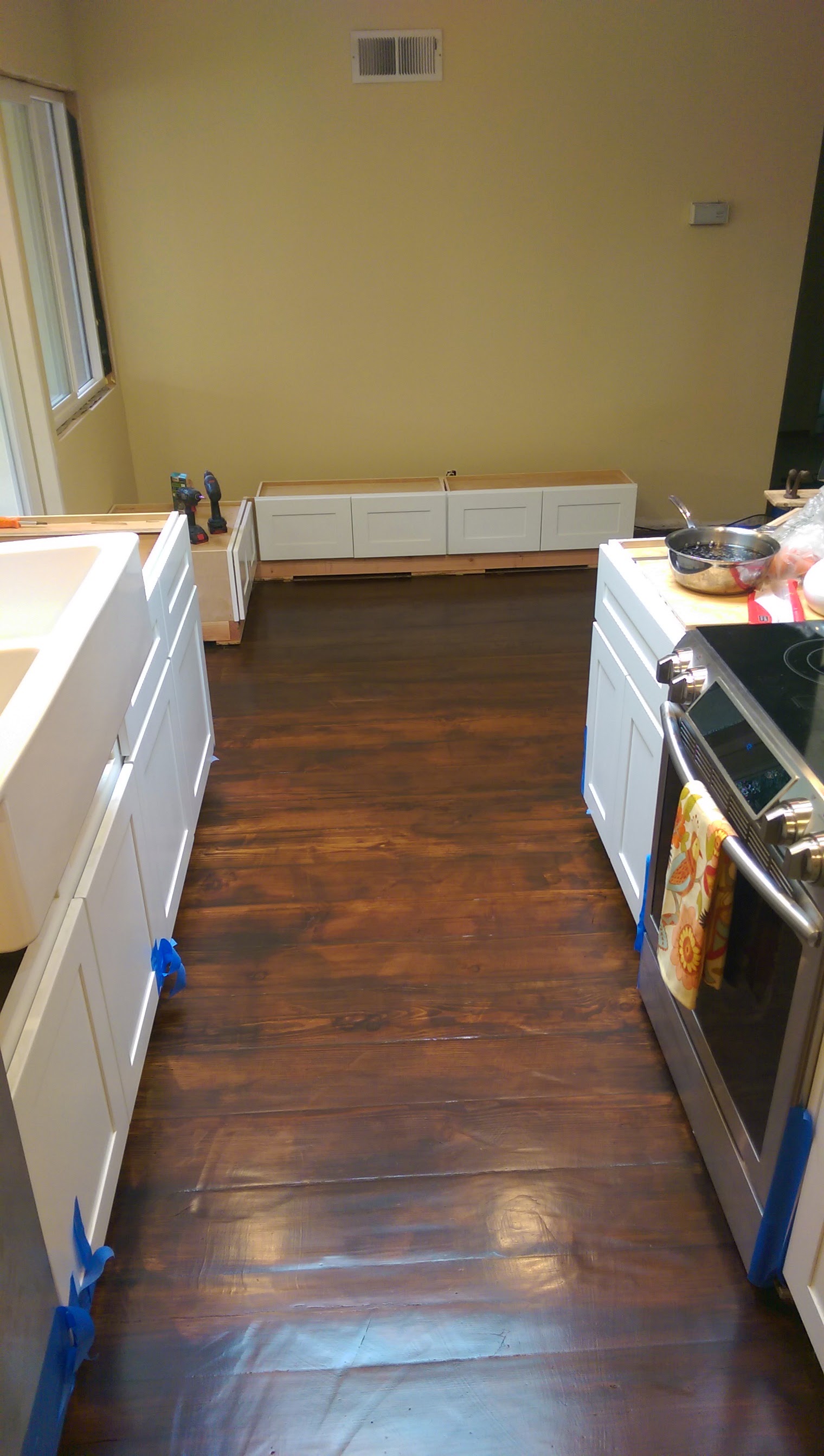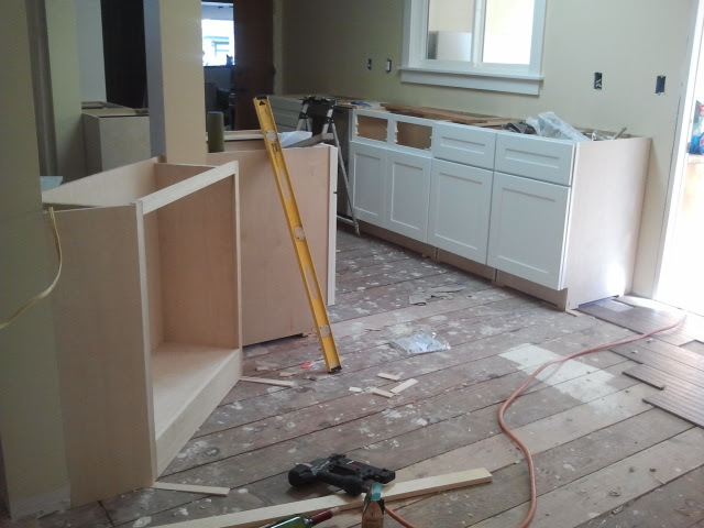 So we spent the next few weekends and after work hours making the pretty sub-floors prettier. We selected cabinetry from Home Depot. They were middle of the line but we loved the simple look and it came with free soft-close hardware which was a nice bonus.