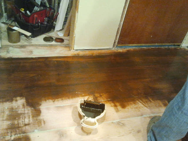 Large puppy eye’d looks ensued. He agreed to try sanding and staining a small portion of the floor.