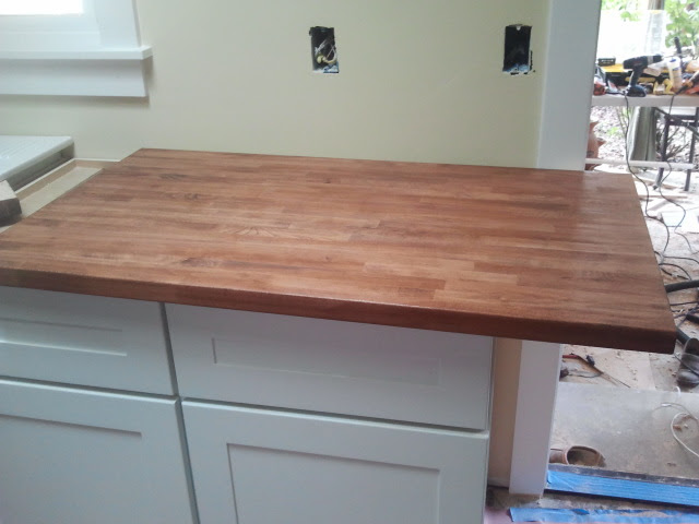 Like most decisions we made on this kitchen, the counter tops were something we really went back and forth on. In my brain I had pictured the white-with-some-grey-flecked-marble that I had seen floating around everywhere in social media. However after researching prices, especially with the funky shape that we were dealing with, I started to reconsider. I also really like the look of butcher-block and at a fraction of the cost, it seemed to make more sense. We got ours from Ikea and it was a steal.