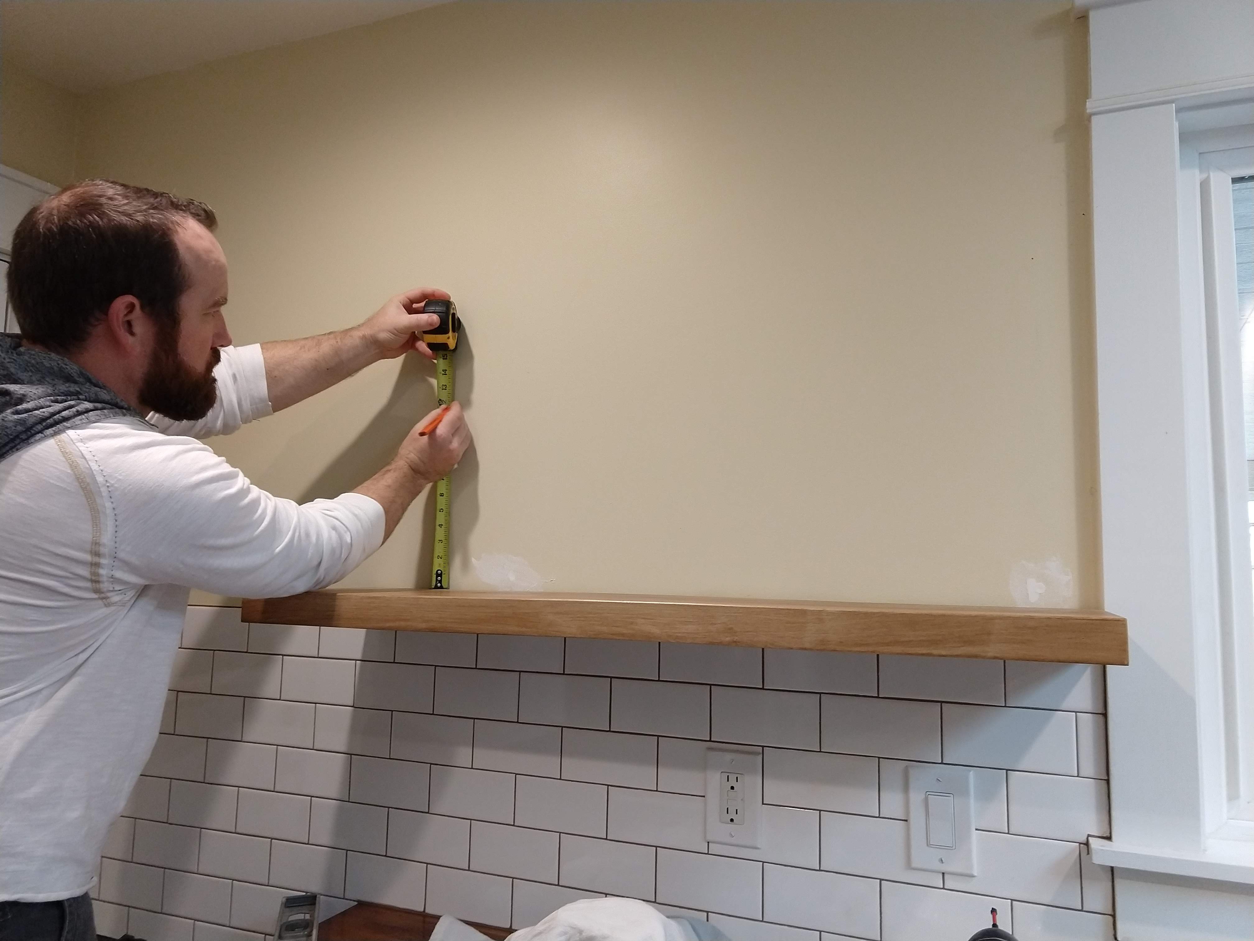 After the holes are drilled, the shelf simply slides on to the bracket. Brian is measuring the placement of shelf number two here.