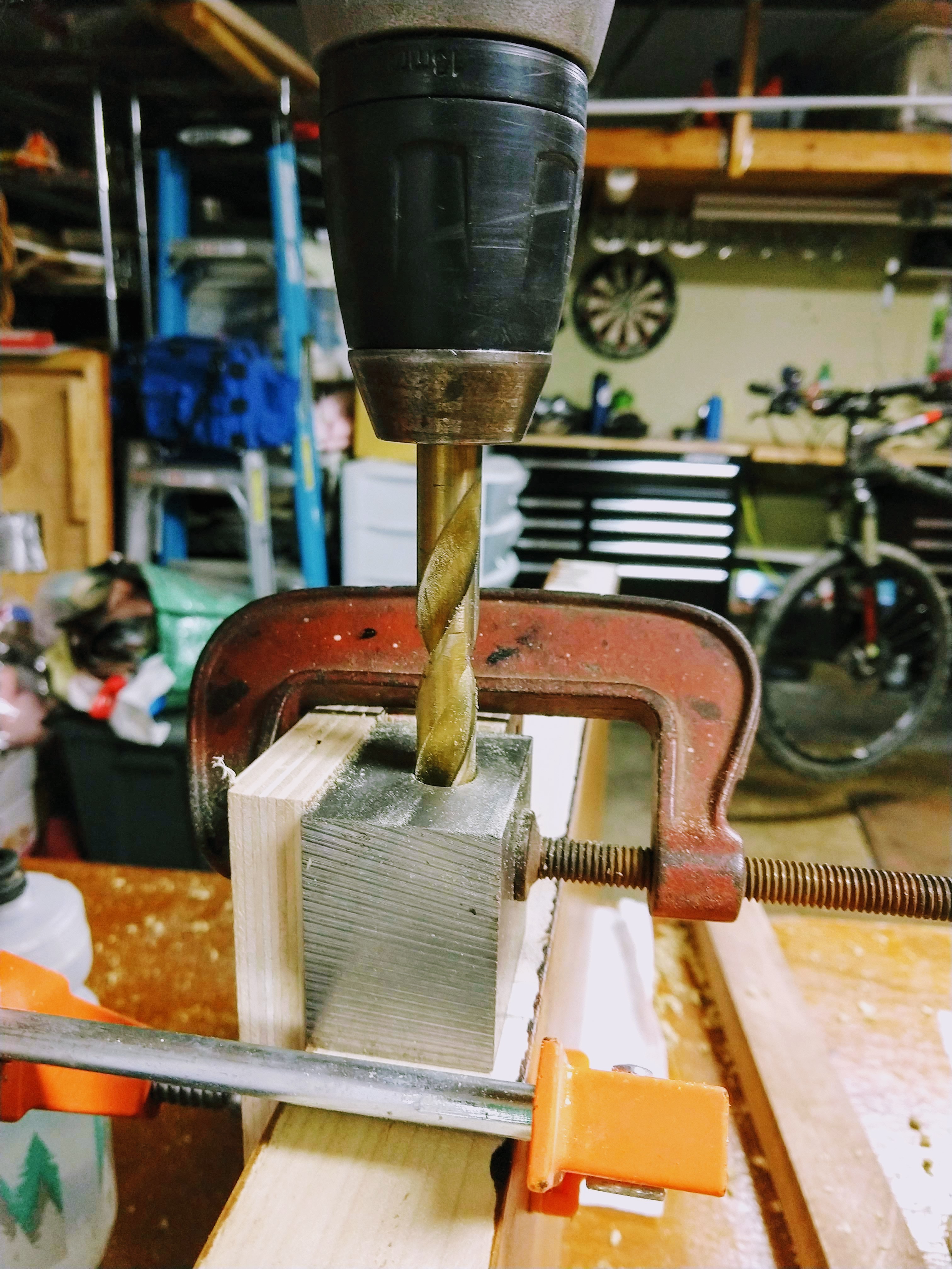 It was pretty important to get the angle of the drill bit in the proper placement, because even a few degrees off and the whole shelf will look wonky. Brian machined a steel guide to ensure the guide holes were perfectly straight. (Genius!)