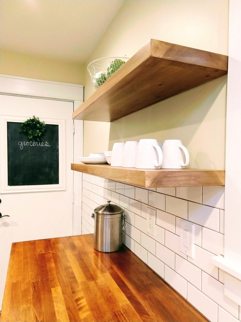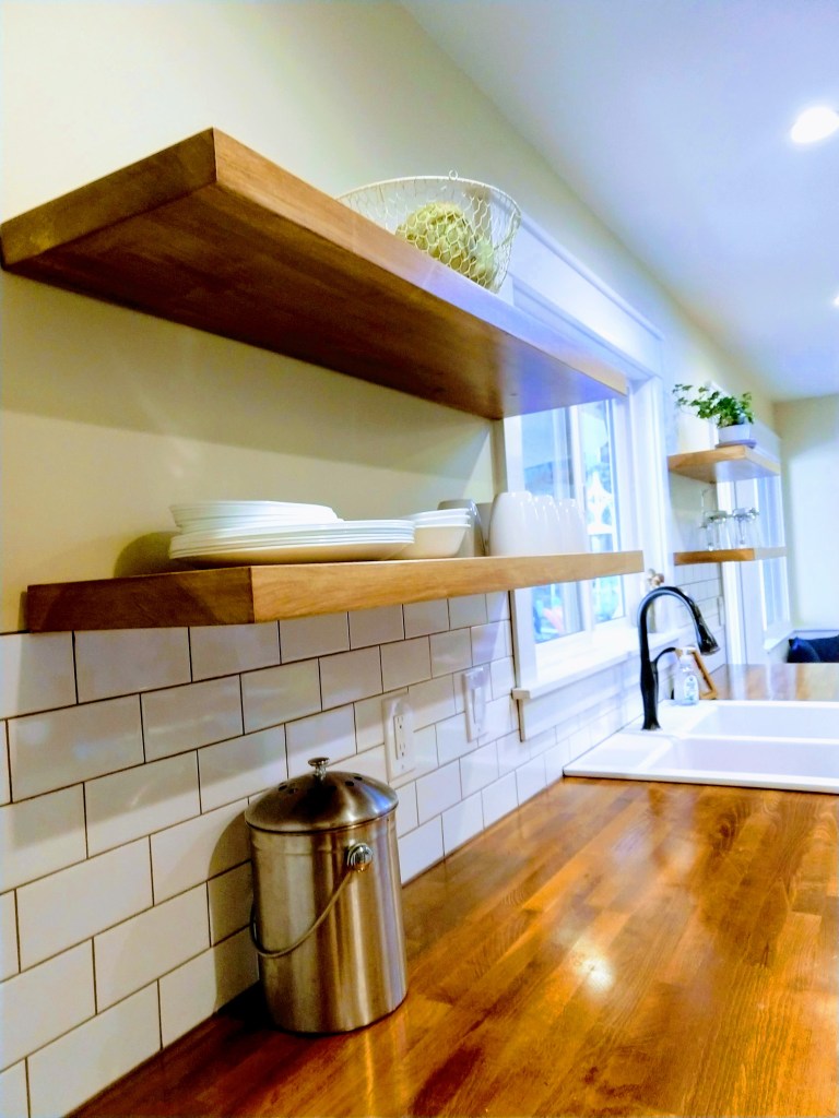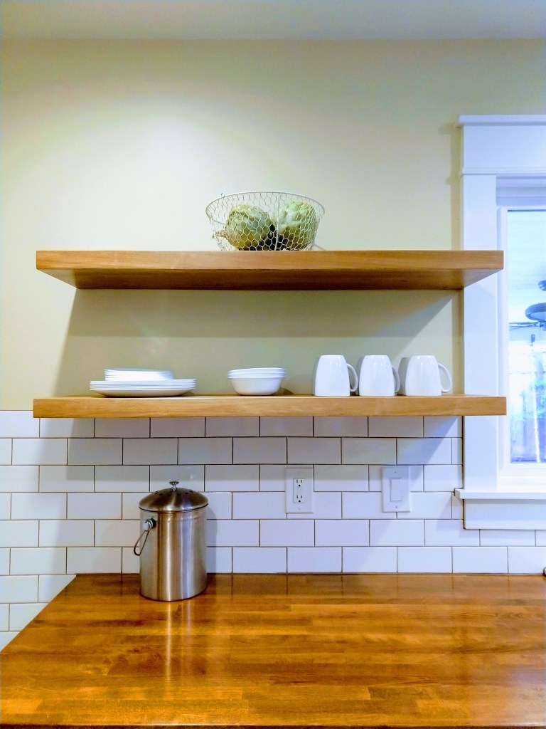 Keeping the theme of bright, simple, and airy, we decided to go with open shelving instead of traditional upper cabinetry. Honestly, our number one contributing factor when deciding this was budget. For 4 solid beautiful Poplar shelves, including hardware and stain, we spent a little under 200 dollars. What we had originally planned was to have two classic upper cabinets with glass fronts. Even Ikea’s options which are notoriously reasonable would have set us back around 600 bucks for a pair.
