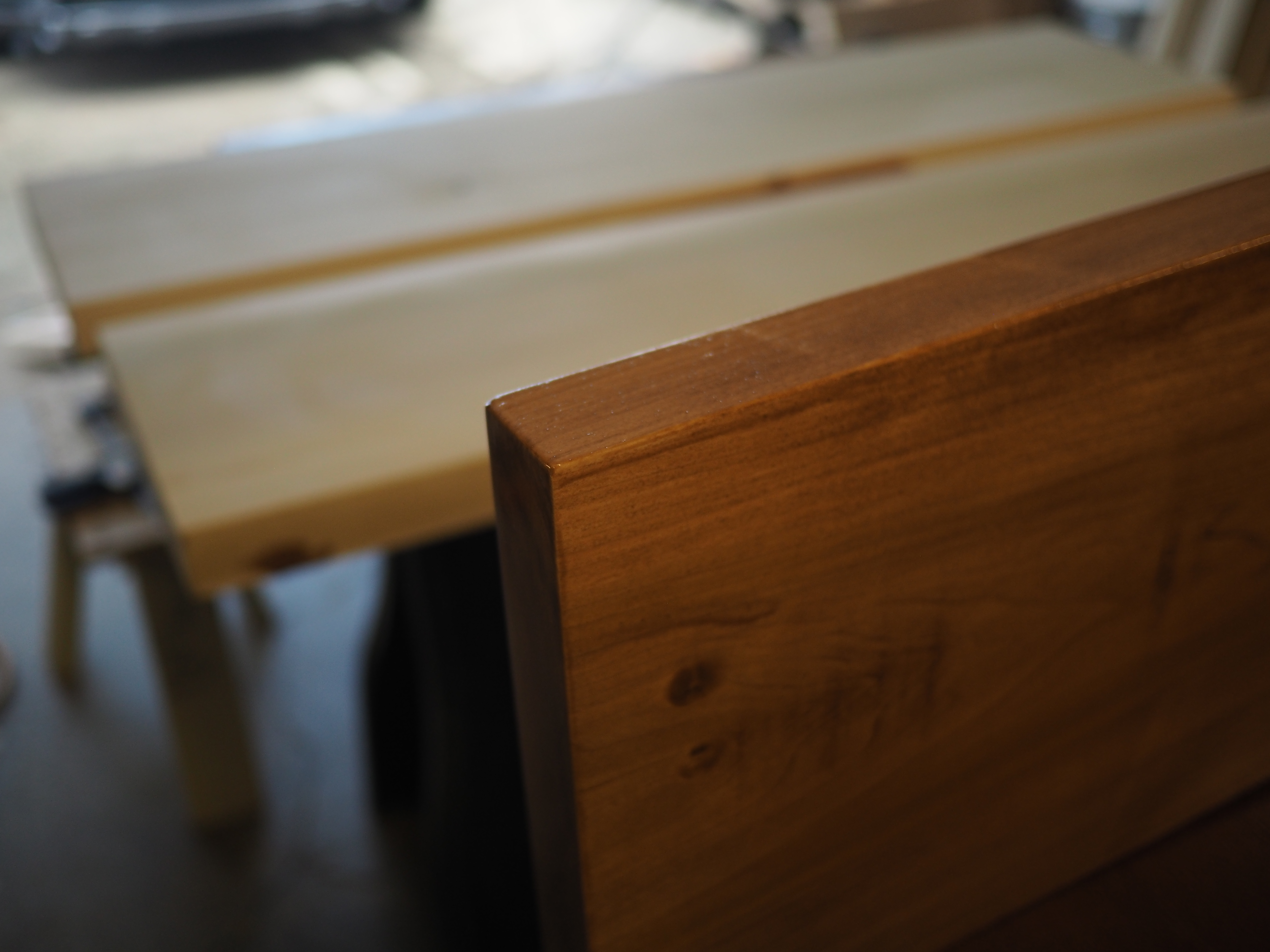 One of Brian’s many genius ideas was to rig up a little stand on an old door to create a stable surface during the staining process. They were screwed in on the blind side so no one was the wiser.