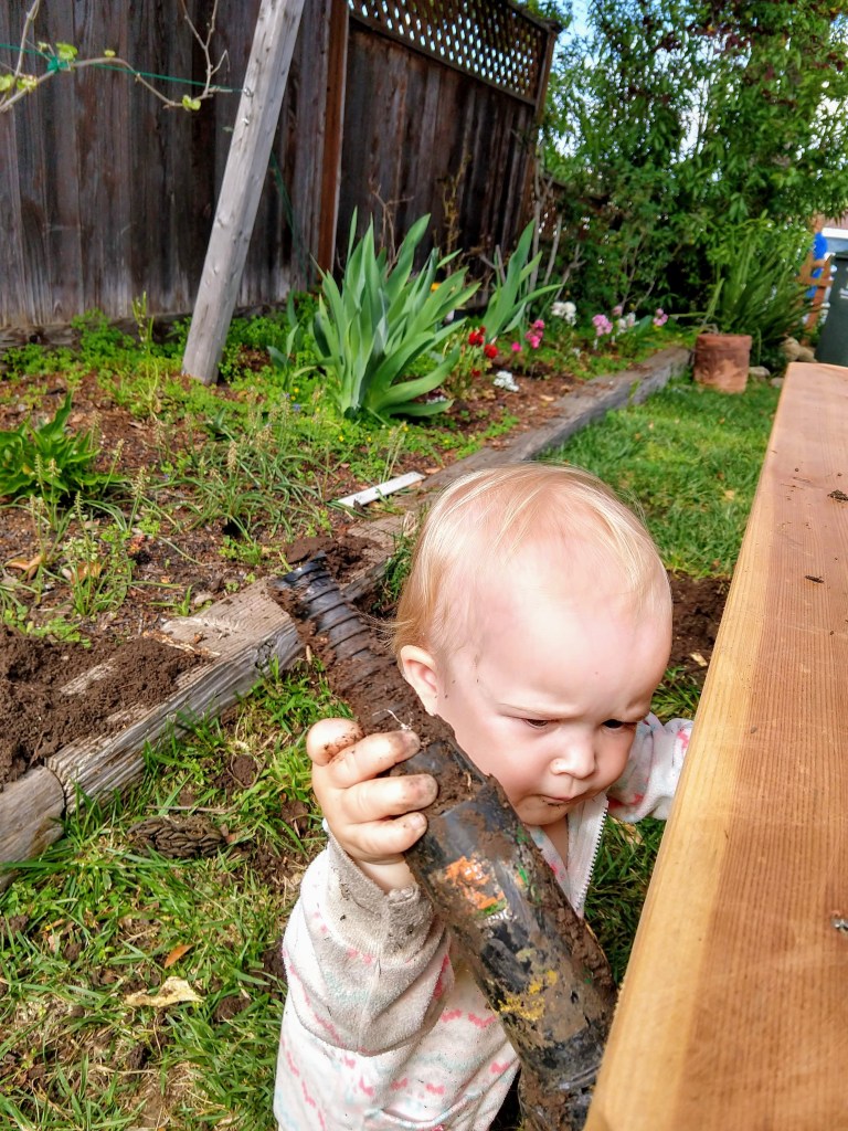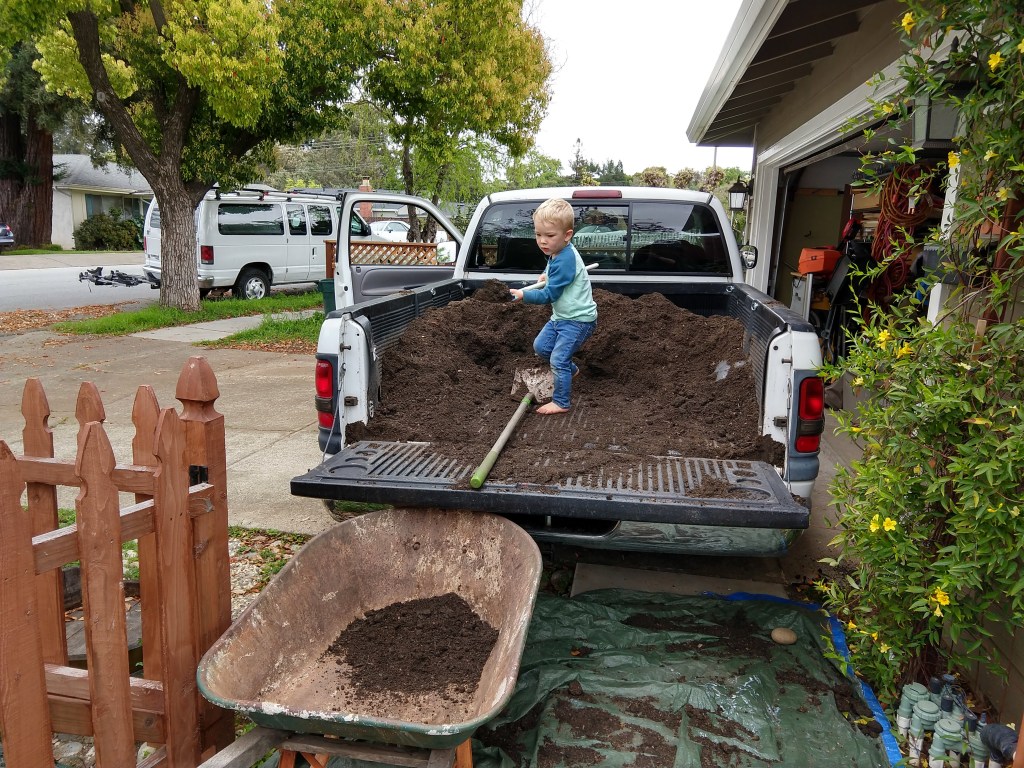 Finally we took a trip to our local supply store and got a full load of organic garden soil which the boys cheerfully spent a Saturday morning shoveling into the box.